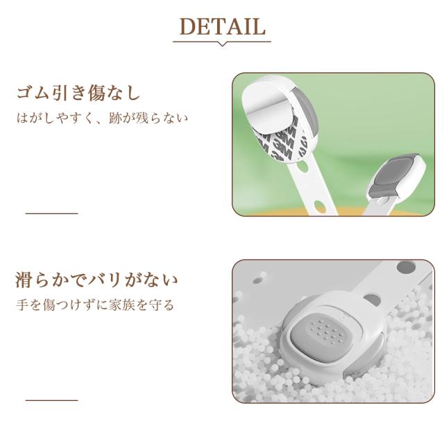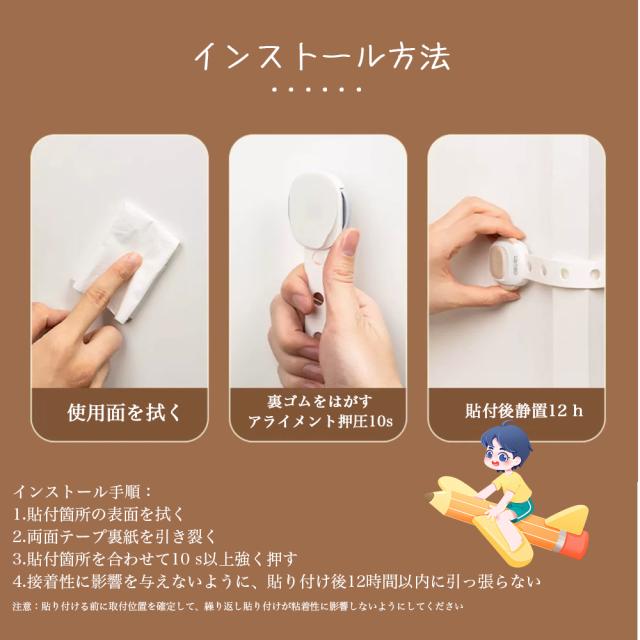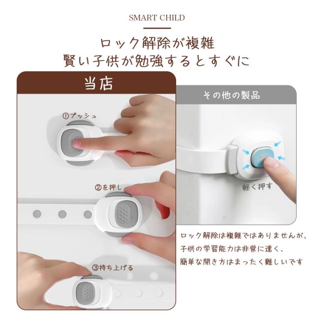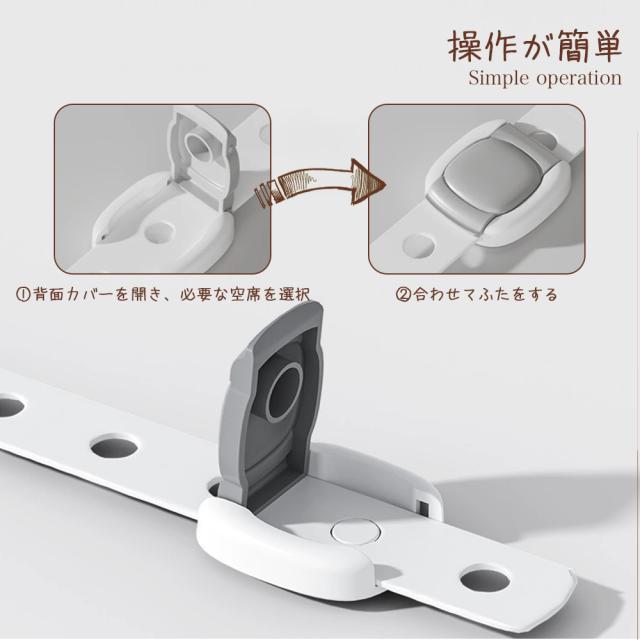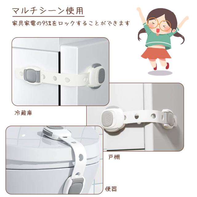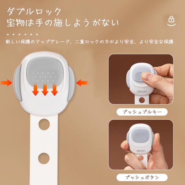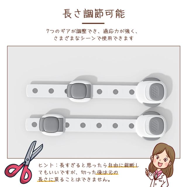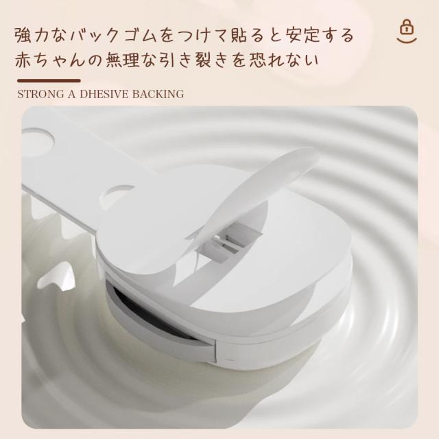 【材質】高品質ABS樹脂、赤ちゃん向けにふさわしいので、ご安心ください。【はがせるタイプ】貼り付けと剥がしが簡単にできます。3Mのテープを採用し、接着力が強いです。剥がしても家具に跡がつきにくく、キレイに取ることができます。※家具の傷を防止するため取り外しの際にはドライヤーで粘着部をよく温めながらお取りください。【高品質ABS樹脂】非毒性、無味、環境にやさしい素材を採用して、赤ちゃん向けにふさわしいので、ご安心ください。引っ張り強さは普通のより強くて、耐久性も高いです。【押しロック】ボタンをスライドするだけでロックが解除できます。成人は楽に開けられますが、赤ちゃんの力ではできない設計です。安全性が備わっています。【?整可能】あらゆるサイズのアプライアンスや家具に合わせて調整できます。ベルト部分の長さを調整してから裏面の剥離紙をはがして取り付けます。
