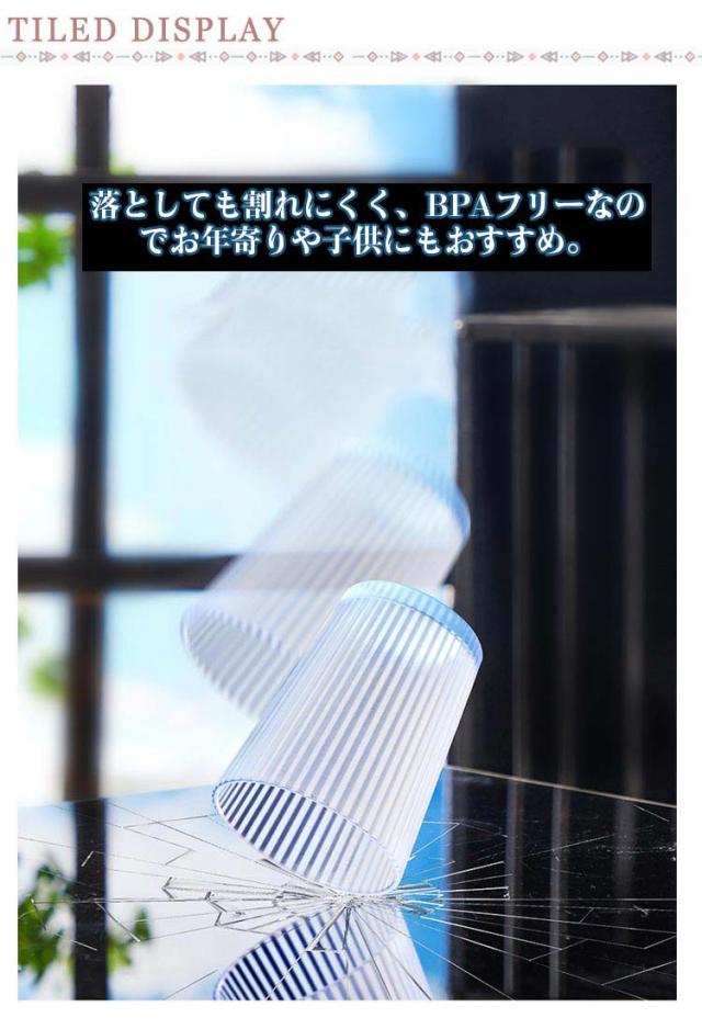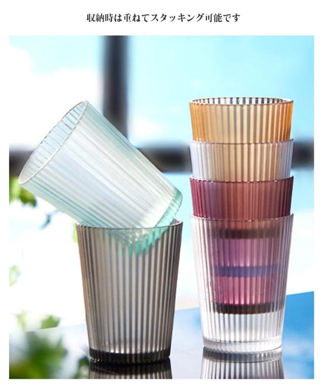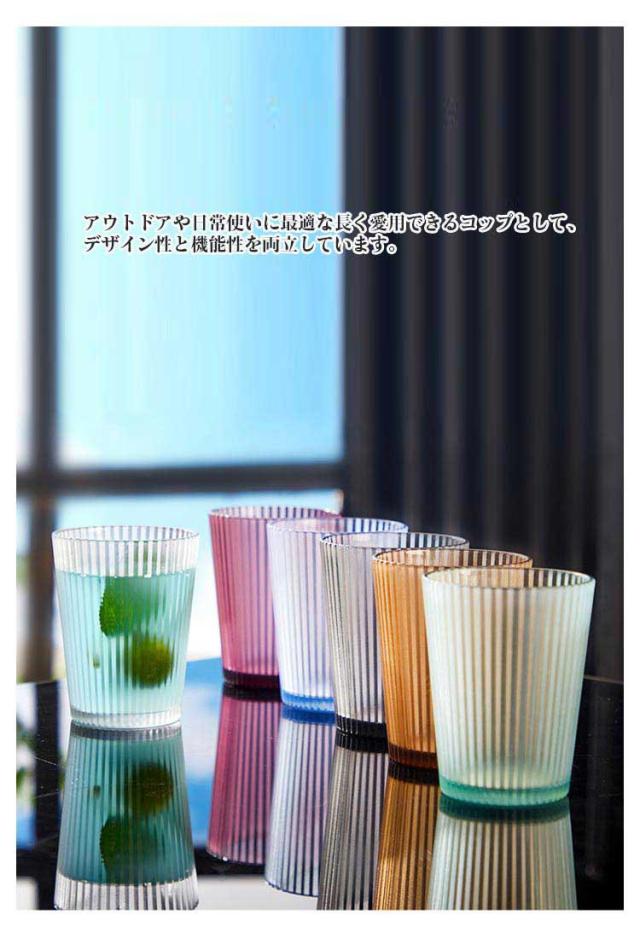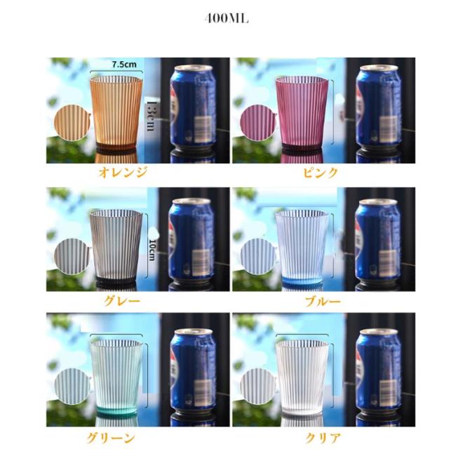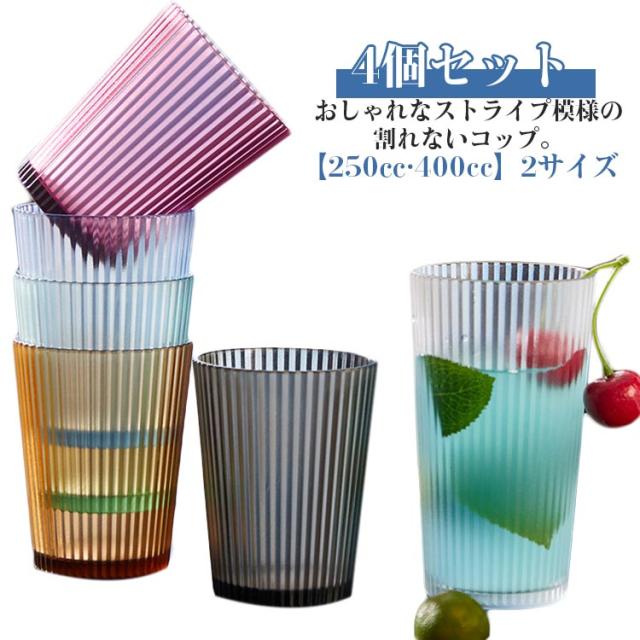 | おしゃれなストライプ模様の割れないコップ。【4個セット】【250cc?400cc】2サイズ 豊かなカラーバリエーションから、お好みのアイテムをお選びいただけます。 トライタン素材を使用しているので、ガラスと比べても見劣りしないクリアな輝きと光沢感があり、曲げや耐久性が強いのが特徴です。 落としても割れにくく、BPAフリーなのでお年寄りや子供にもおすすめ。 アウトドアや日常使いに最適な長く愛用できるコップとして、デザイン性と機能性を両立しています。 収納時は重ねてスタッキング可能です | |