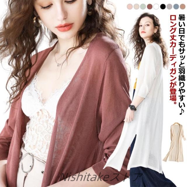 送料無料 カーディガン ロング レディース UVケアサマーニットカーディガン 羽織り カーデ 羽織 ロングカーデ 長袖 ロング丈 薄手 ニット ゆったり 体型カバー 無地 涼しい エレガント 上品 トップス 透け感 サイドスリット おしゃれ