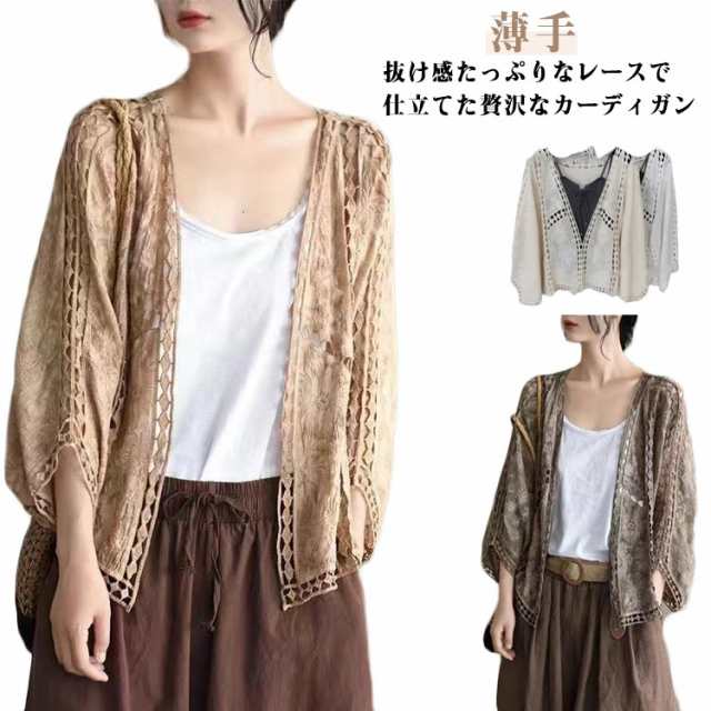 | 抜け感たっぷりなレースで仕立てた贅沢なカーディガン 透け感がありながら、外では涼しく、冷房の効いた室内では寒さ対策になる。 さっと羽織るだけで上品スタイルが完成する上に、紫外線対策にもお役たち。 ドルマンスタイルも楽に体型カバー効果。 適度に広がりながらもだらっと見えない様なデザイン。 短めの丈で、ハイウエストのボトムスとも好相性のカーディガン。 タンクトップの上に羽織るだけでもとても上品な感じ。 夏にとてもピッタリの可愛らしいカーディガン。 | |