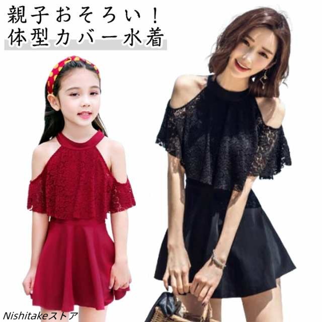 親子 おそろい 水着 レディース ワンピース 体型カバー水着 レースワンピース 2way オフショルダー セクシー バックシャン レース 透け 露出控えめ 女の子 子供 キッズ オトナ女子 ママ水着 20代 30代 40代 M L XL 2XL