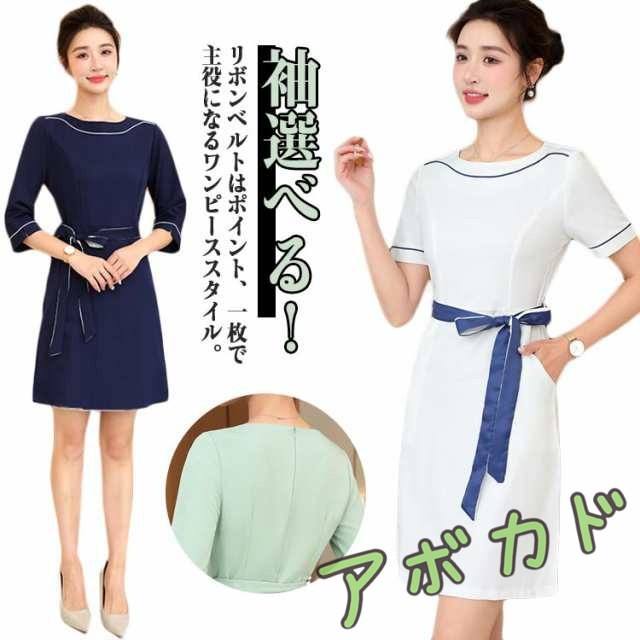 リボンベルト サロン エステ サロン ワンピース きれいめ 大きいサイズ 制服 レディース 女性 エステユニフォーム 七分袖 ネイル 美容 半袖 おしゃれ 歯科衛生士 リボンベルト 作業服 S M L XL 2XL 3XL