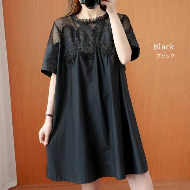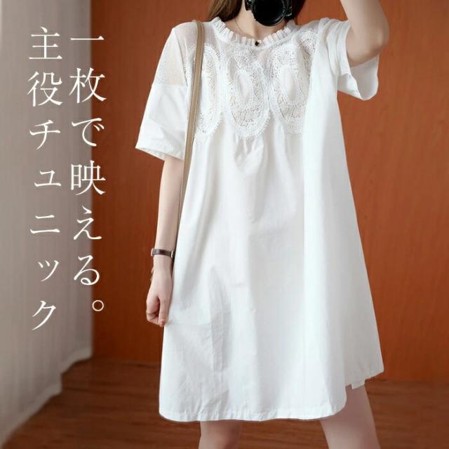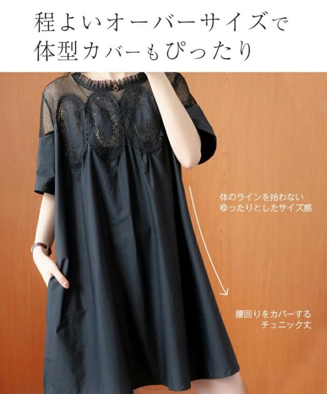 チュニック カットソーワンピース 異素材切替 チュニックワンピース レディース 夏 膝上 膝丈 クルーネック メッシュ レース 重ね着 レイヤード ワンピース Tシャツワンピ 体型カバー ファッション
