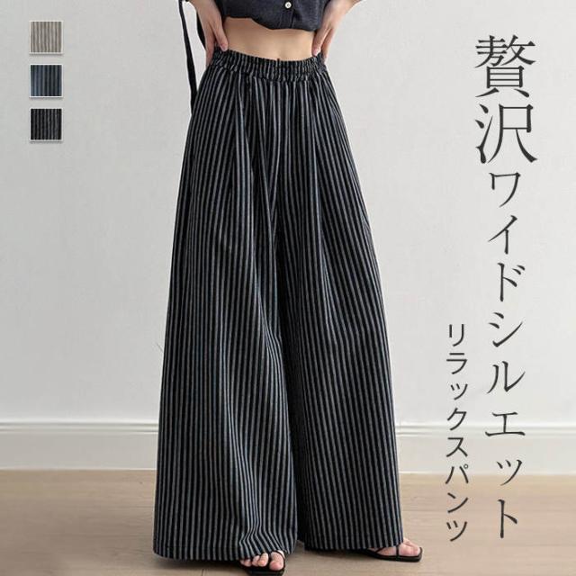 ストライプパンツ レディース 春 夏 秋 ワイドパンツ ストライプ パンツ ボトムス ズボン 柄パン 総柄 キレイめ ワイド ガウチョ イージーパンツ ハイウエスト ゴム サイドポケ ストレートパンツ