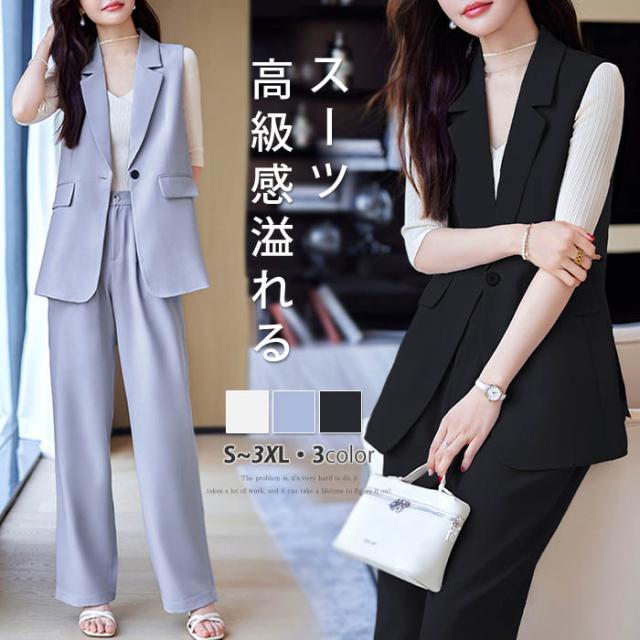 スーツ ベスト セレモニー レディース 卒業式 パンツスーツ ワイドパンツ セットアップ パンツ ベストセットアップ vネック ノースリーブ トップス 上下セット 2点セット エレガント