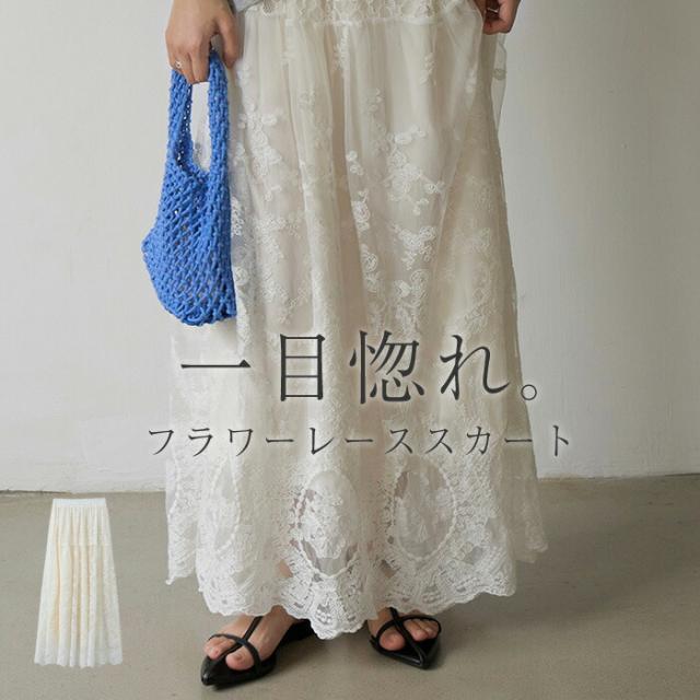 スカート 刺繍 レース レディース ボトムス ロング ロングスカート マキシ マキシスカート 花柄 Aライン フレア フレアスカート レーススカート 長い ゴム ボリューム ゆったり 体型カバ ボトム