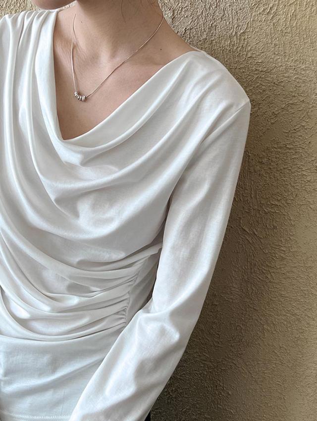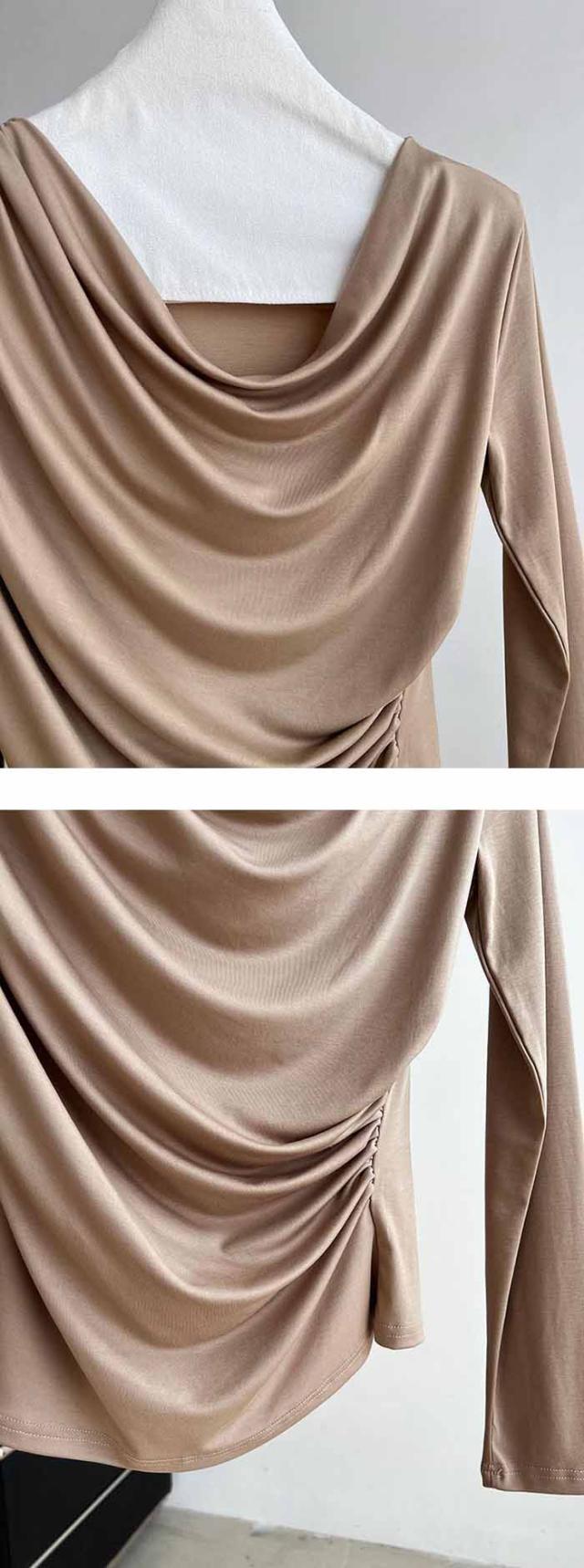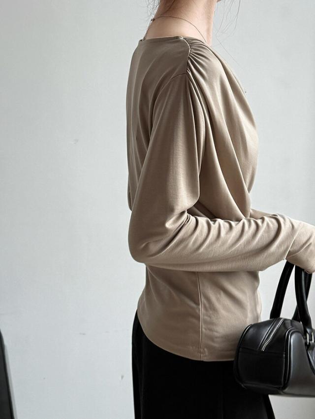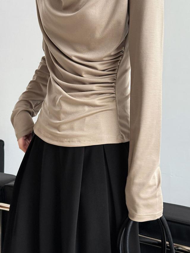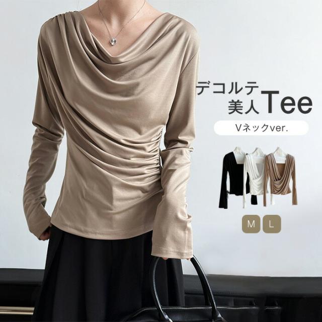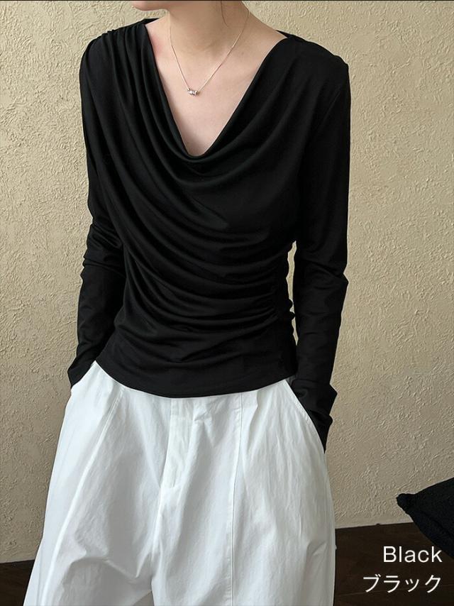 シャーリングトップス カットソー レディース トップス 長袖 無地 変形 シャーリング ギャザー ブラウス ロンT tシャツ 落ち感 薄手 プルオーバー レープ モード きれいめ 細見え 上 シンプル