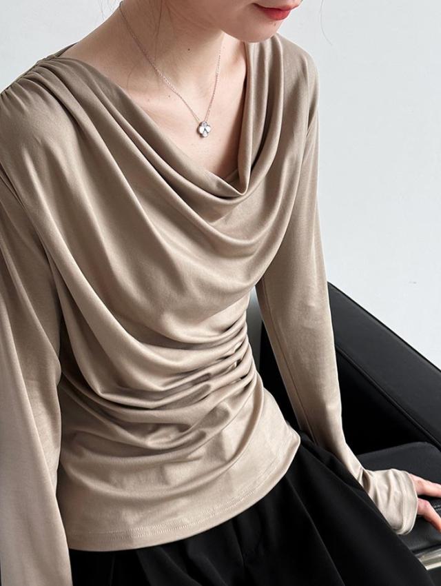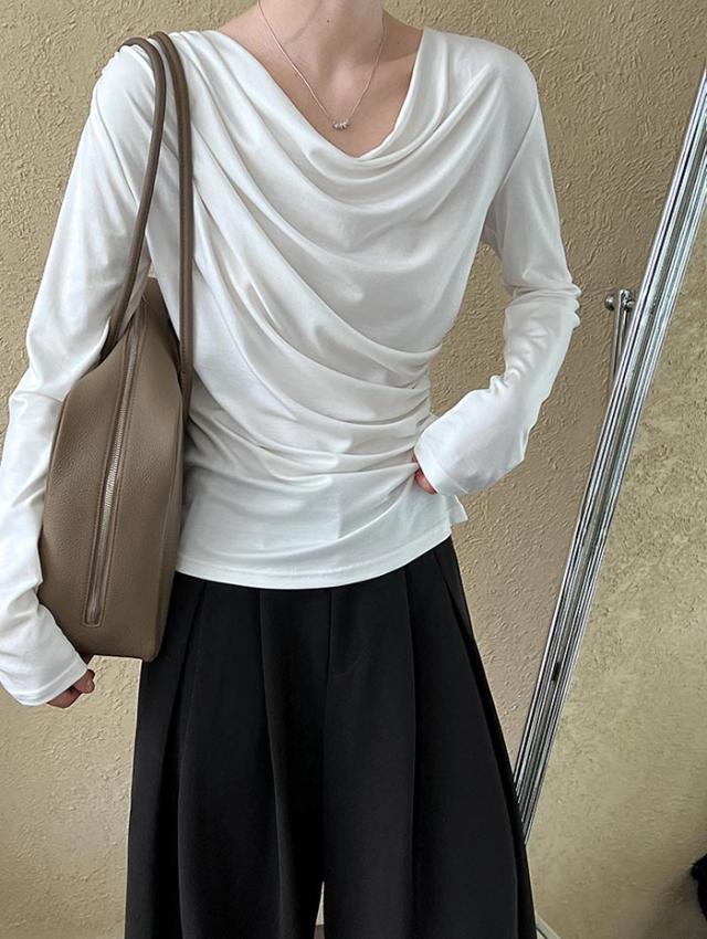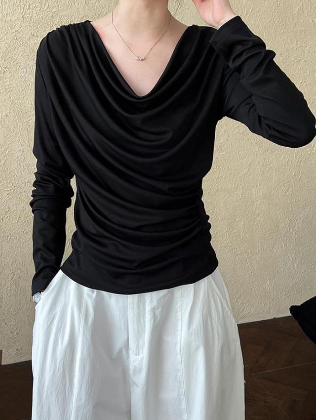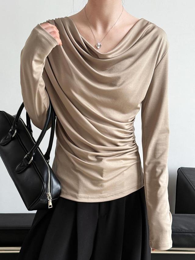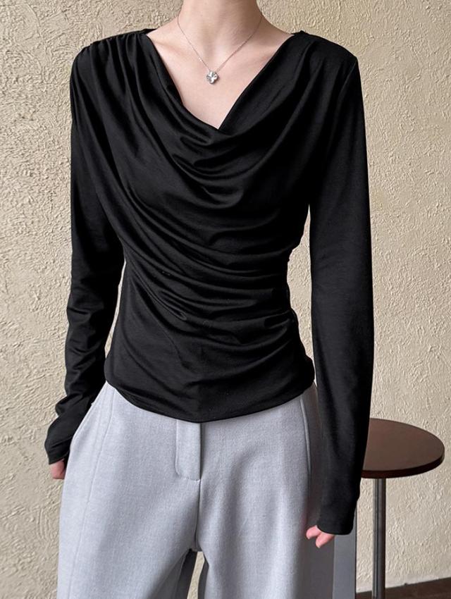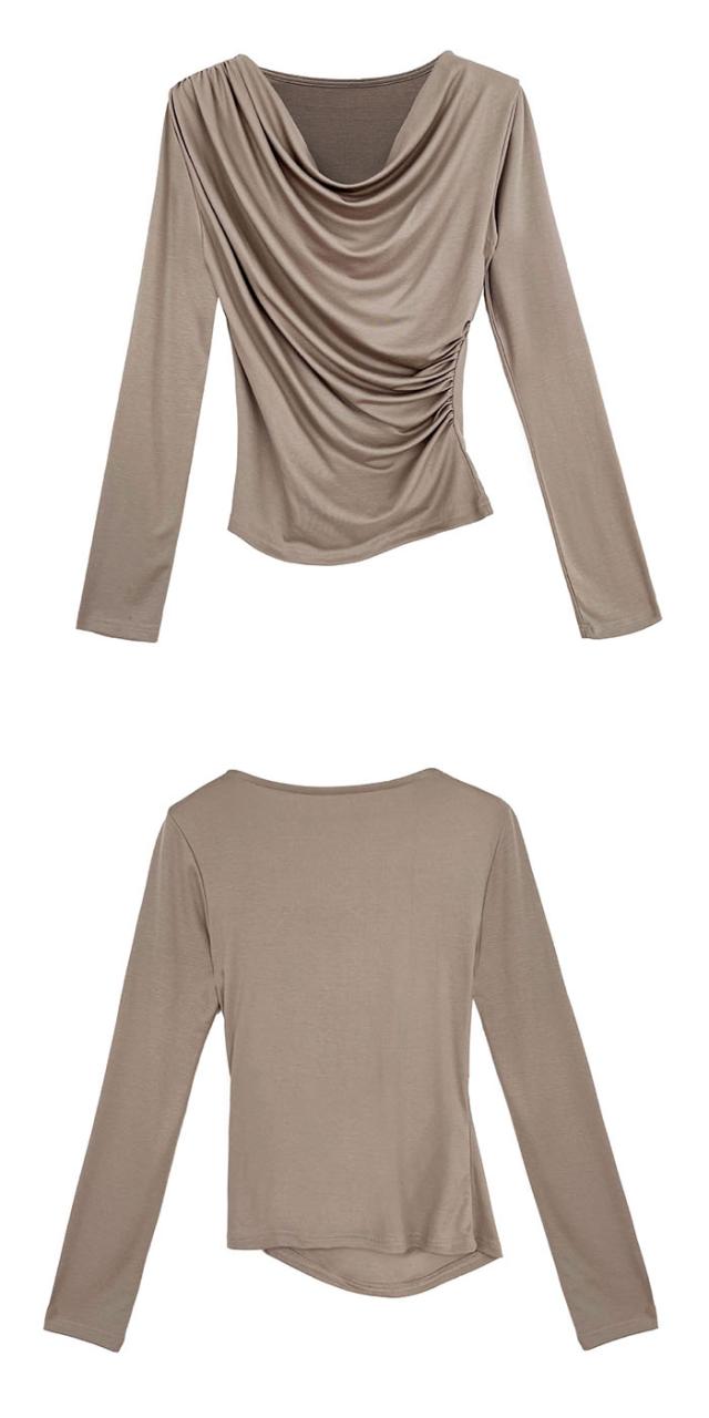 シャーリングトップス カットソー レディース トップス 長袖 無地 変形 シャーリング ギャザー ブラウス ロンT tシャツ 落ち感 薄手 プルオーバー レープ モード きれいめ 細見え 上 シンプル