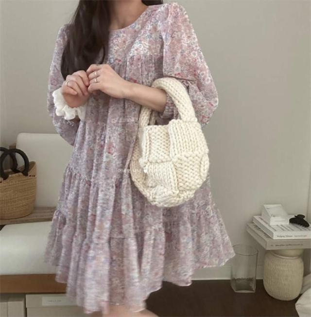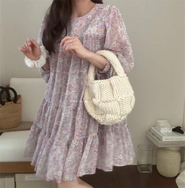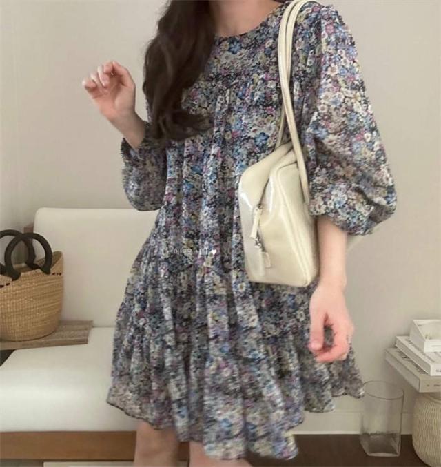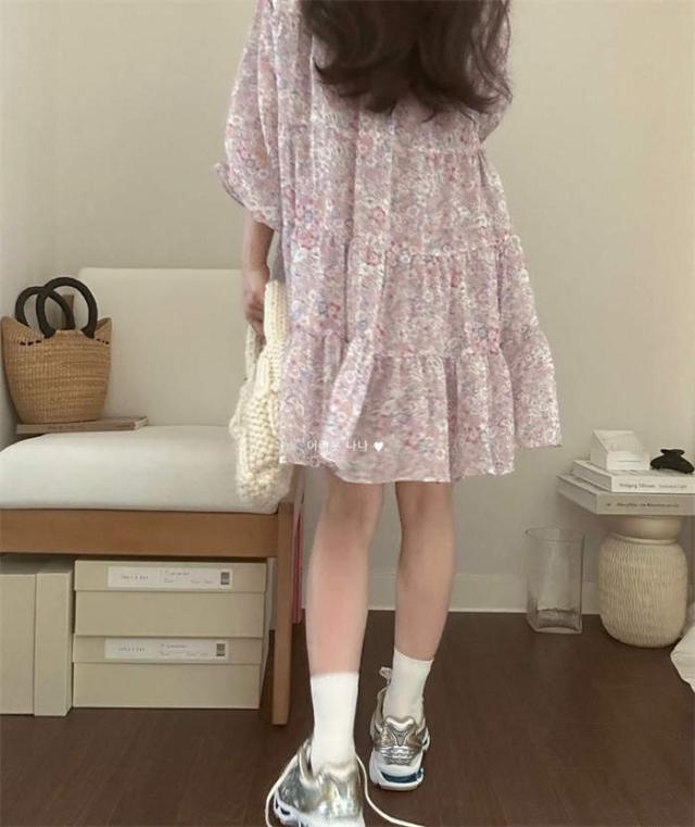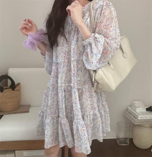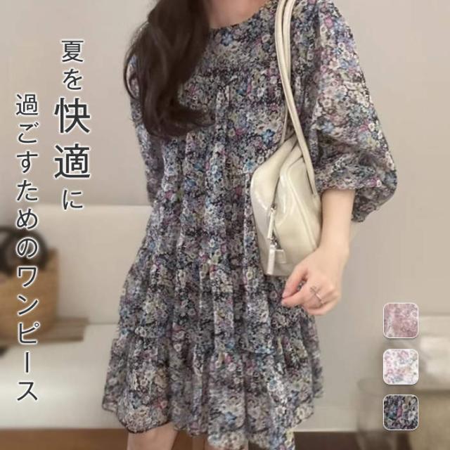 ワンピース 花柄 チュニック 夏 レディース ミニワンピース ゆったり 7分袖 クルーネック 膝上丈 かわいい 体型カバー シフォン 定番 おしゃれ きれいめ シンプル お出かけ 涼しい カジュアル
