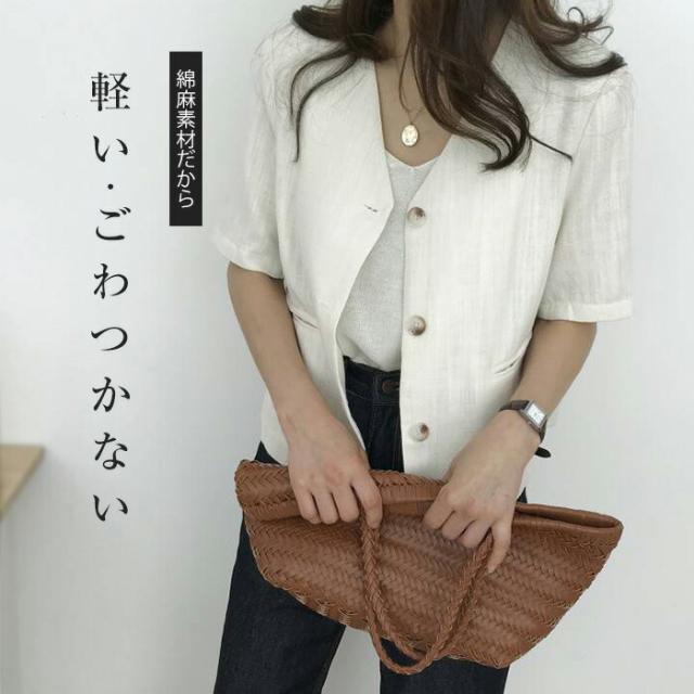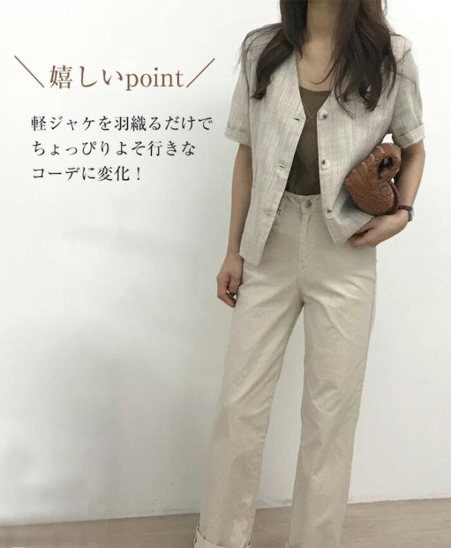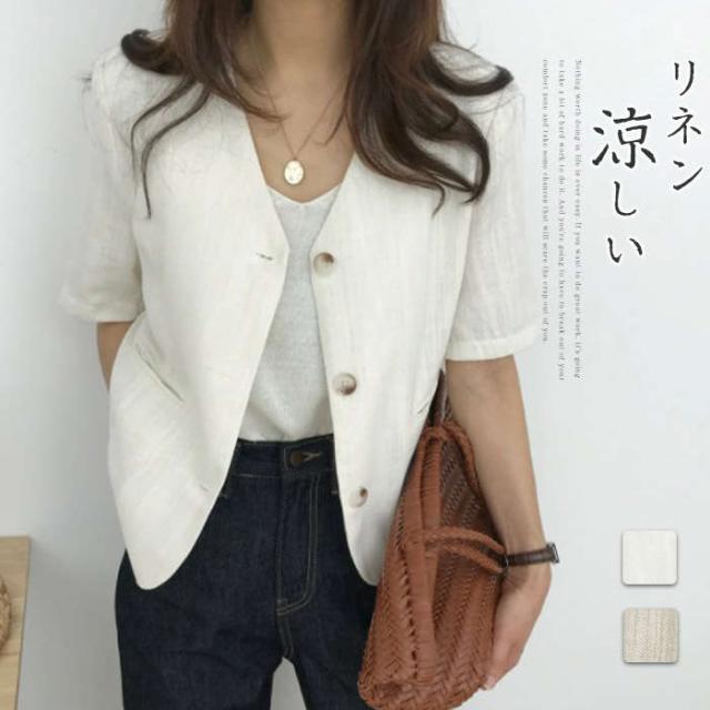ジャケット レディース リネン 半袖 サマージャケット リネンジャケット ライトアウター 薄手アウター ノーカラー 開襟 夏 夏素材 ショート丈 大人 きれいめ 涼しい 冷房対策 白 杏色 日焼け止め