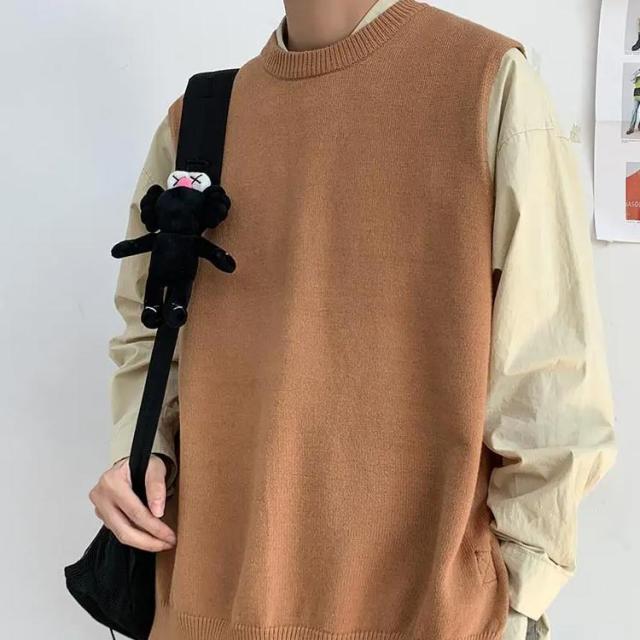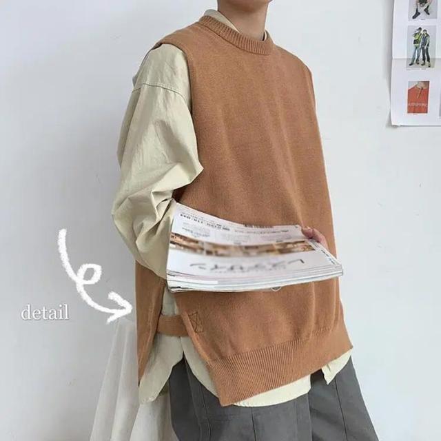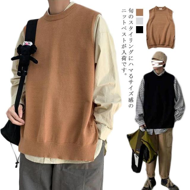 クルーネック セーター レイヤード ニットベスト ベスト スクールベスト サマーニット ノースリーブ サマーベスト 学生 大きめ サイドスリット ざっくりニット カジュアル メンズ ドロップショルダー