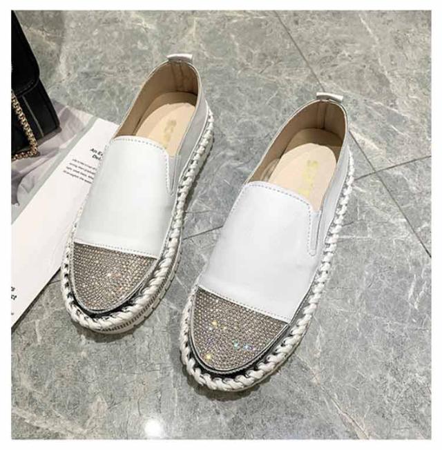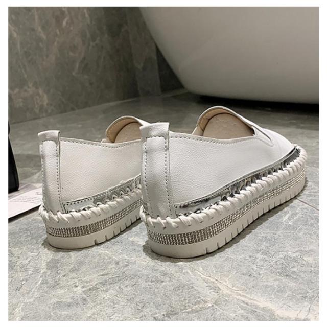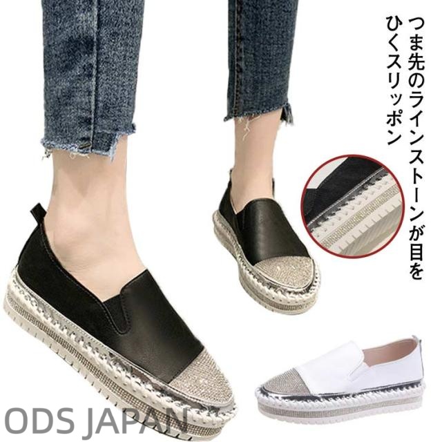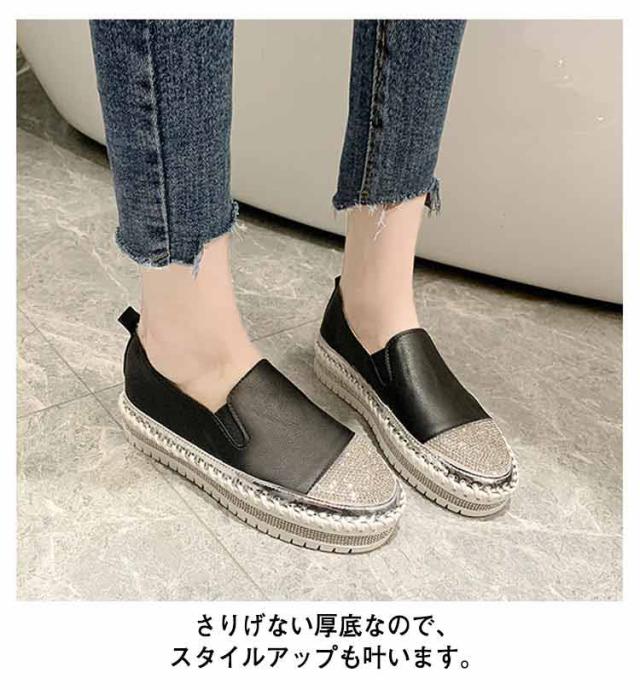 レディース ローファー ラインストーン 異素材コンビスリッポン 靴 きれいめ シューズ ローカット 切り替え スニーカー おしゃれ カジュアル ホワイト ブラック 厚底
