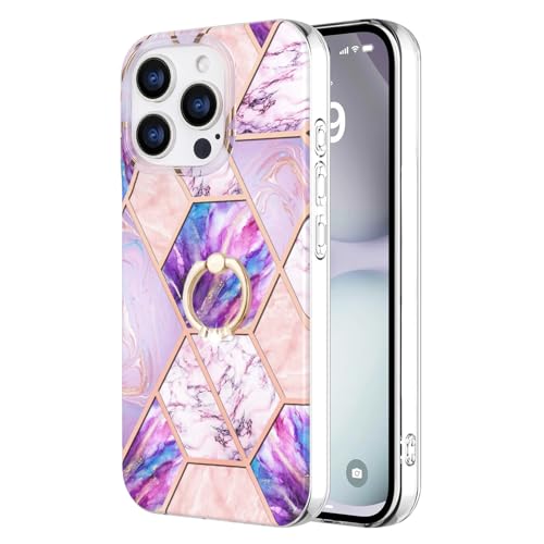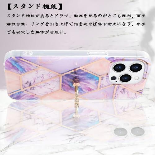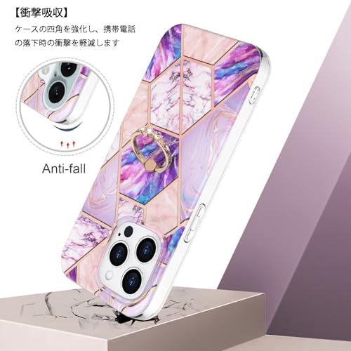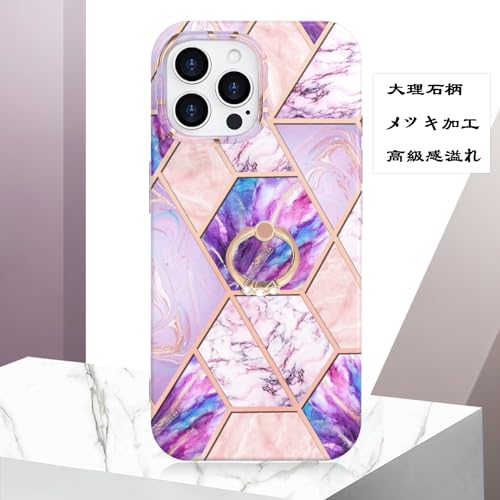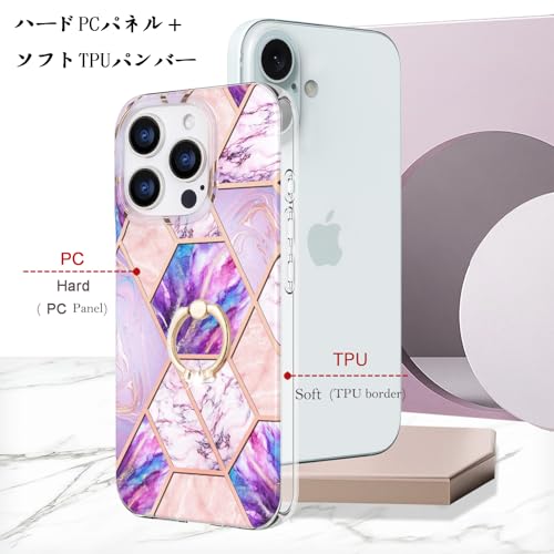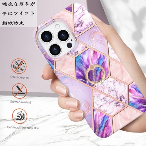 iPhone 15 Pro ケース リング付き 大理石柄 メッキ加工 キラキラ かわいい 美しい おしゃれ 女性 人気保護カバー 薄型 軽量 アイフォン15プロ 携帯電話かばー (パープル-ピンク iPhone15 Pro)