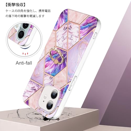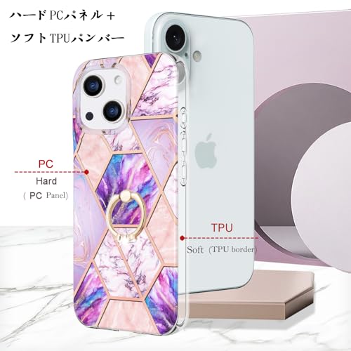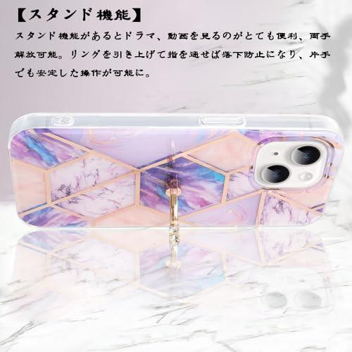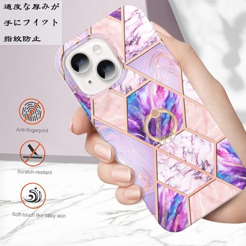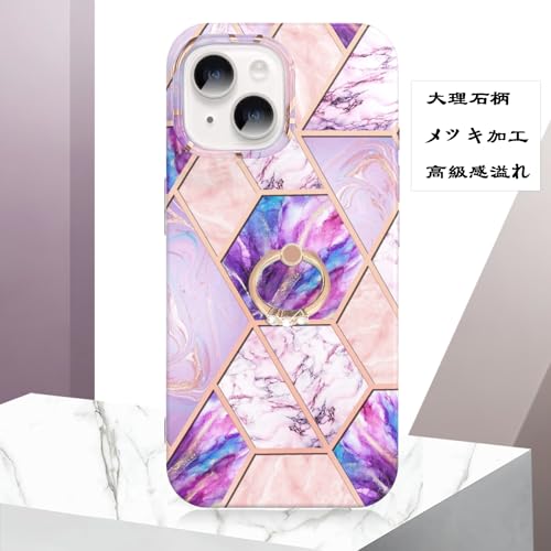 iPhone 15 Plus ケース リング付き 大理石柄 メッキ加工 キラキラ かわいい 美しい おしゃれ 女性 人気保護カバー 薄型 軽量 アイフォン15プラス 携帯電話かばー (パープル-ピンク iPhone15 Plus)