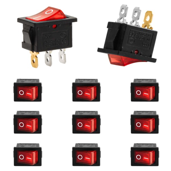 10個 オン/オフスイッチ 2ポジション 3ピン スナップイン式 ボート用トグルロッカースイッチ SPST Kcd1 赤色(ライト付き)125V 250V