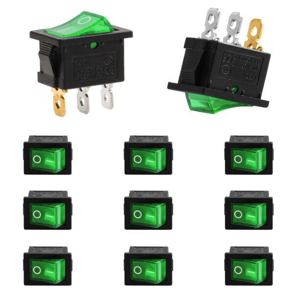 10個 オン/オフスイッチ 2ポジション 3ピン スナップイン式 ボート用トグルロッカースイッチ SPST Kcd1 緑色(ライト付き)125V 250V