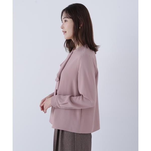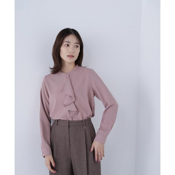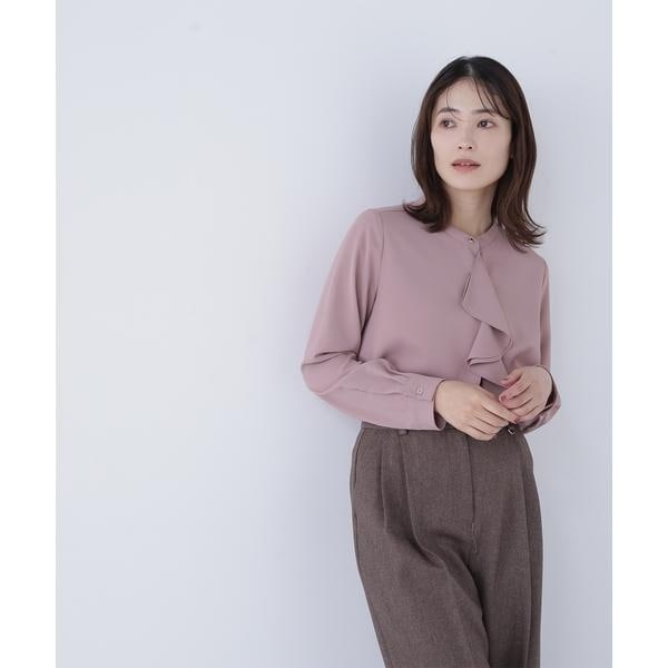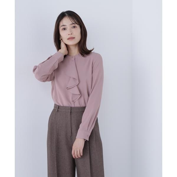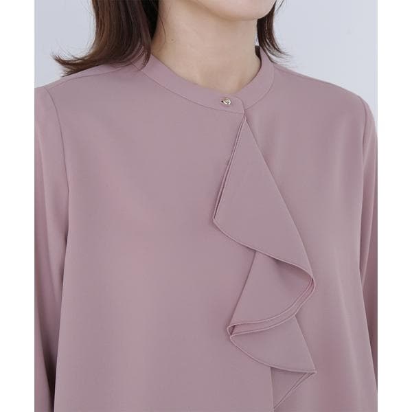 華やかな2枚仕立てのラッフルが目を引き、軽やかな揺れ感が女性らしさを引き立てるブラウス。首元に付けたゴールドカラーの釦が上品なアクセントになっています。フェミニンさときちんと感があり、通勤スタイルにもぴったり。ダブルラッフルや金色ボタンがジャケットインでも存在感を発揮する、ONにもOFFスタイルにも万能な一枚です。<素材>肌触りが心地よい合繊素材を使用。ジョーゼットの表面が上品なトロミ素材で、シワになりにくく取り扱いやすいです。<詳細>仕様・前ボタン裏地・なし透け感・なし / 光沢・なし / 伸縮性・なし生地の厚さ・普通※モデルの着用画像の場合、光の当たり具合により、実際の色味と異なって見えることがございます。色味は、商品単体の画像をご参照ください。