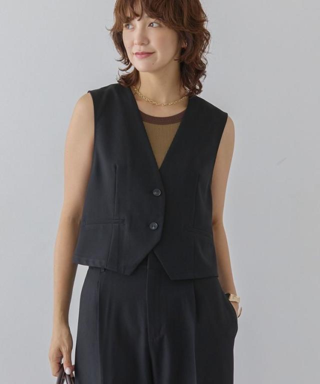 コンパクトなサイズ感でトレンドを押さえたデザインベスト。程よいハリのある素材とウエストのダーツがすっきりとした印象です。後ろにはベルトを施し、モード感をプラス。アームホールが広めなのでレイヤードした時のごわつきも気になりません。デニムと合わせたきれいめカジュアルスタイルがおすすめです。透け感[なし]