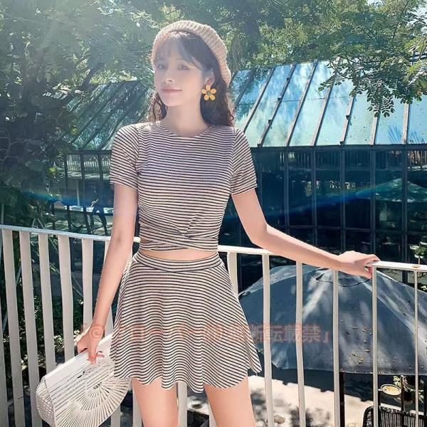 水着 体型カバー 可愛い レディース 2set ビキニ 半袖 オシャレ おしゃれ トップス スカート 2点セット 女 オトナ女子 女性 セパレート 大人 大きいサイズ 洋服みたい タンキニ 流行 ボーダー リボン フレアスカート 吸水速乾