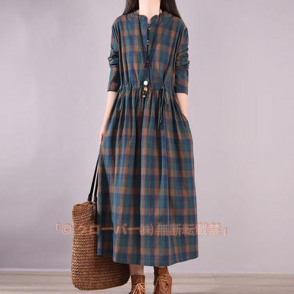 チェックワンピース 秋ワンピース ロングワンピース 長袖ワンピース レディース ワンピース 秋物 ロング丈 ゆったり チェック柄 リボン付き 長袖 30代 大人