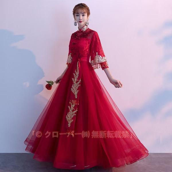 ロングドレス チャイナドレス ロング丈 マキシ丈 チャイナ ドレス 七分袖 レース チュール 花 エスニック柄 中国風 パーティードレス 結婚式 宴会 年会 二次会
