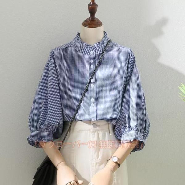 ブラウス レディース トップス シャツ 立ち襟 フリル チェック ぽわん袖 五分袖 七分袖 春 春服