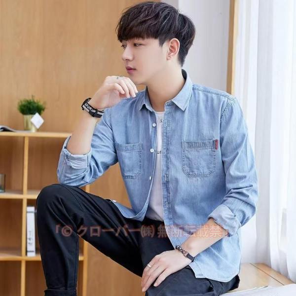デニムシャツ メンズ 長袖 無地 綿100% ポケット付き 柔らかい ウォッシュ加工 カジュアル アメカジ 新作
