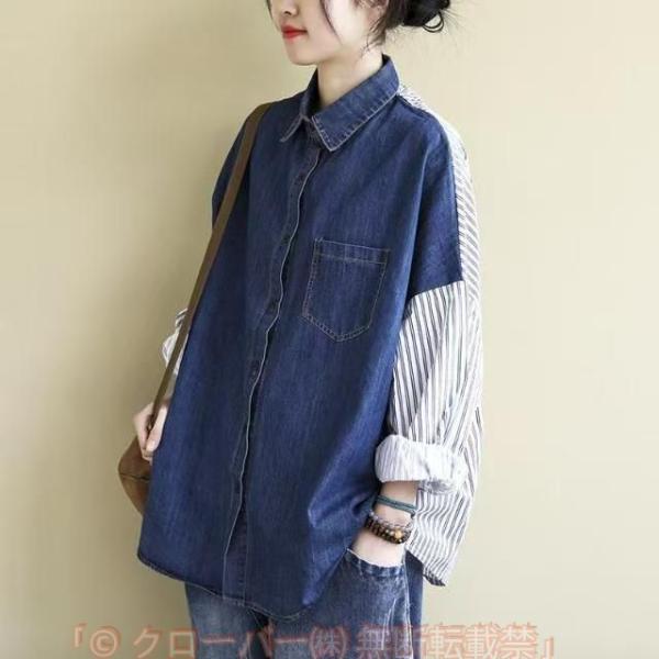 デニムシャツ レディース 長袖 トップス ゆったり シルエット 大きいサイズ 異素材切り替え 体型カバー 大人 女子 秋 コーデ オシャレ 送料無料