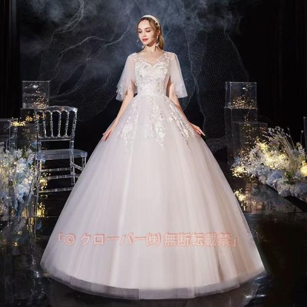 ウェディングドレス 袖あり 白 結婚式ドレス 二次会ドレス ロングドレス Aライン Vネック 花嫁ドレス 海外挙式 披露宴 ホワイトドレス 刺繍