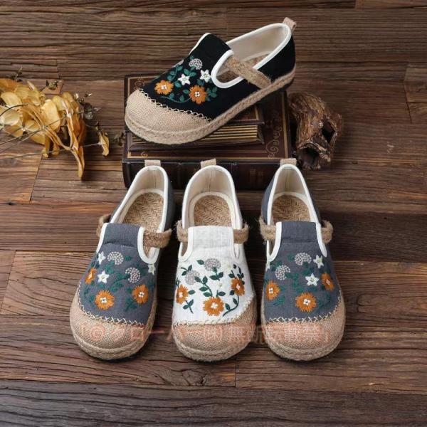 刺繍パンプス レディース シューズ ローヒール 夏靴ぺたんこ 走れる 歩きやすい通気性抜群マタニティー散歩 滑りにくい痛くない リネンわら織り美脚 おしゃれ チャイナドレス エスニック
