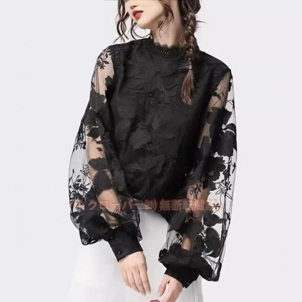 シャツ ブラウス レディース トップス エレガント シースルー 花柄 レース シフォン ブラウス ハイネック 長袖 ボリューム袖 大きいサイズ 春新作 春 夏 春色 春服 春sale シャツ ブラウス