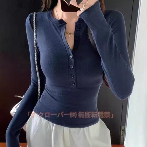 長袖tシャツ レディース 薄手 カットソー ヘンリーネック ロンT 春服 長袖カットソー おしゃれ かわいい シンプル タイト 無地 ボタン ストレッ