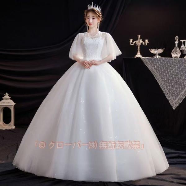 海外挙式 披露宴 二次会ドレス ウェディングドレス Aライン 袖あり ベルスリーブ チュール 花嫁ドレス 結婚式ドレス ホワイトドレス Vネック 素敵