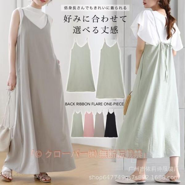 バックリボンキャミワンピース 夏秋物 レディース ロングワンピ ミモレワンピ 2丈 ゆったり 無地 ワンピース 大人 可愛い 揺れる