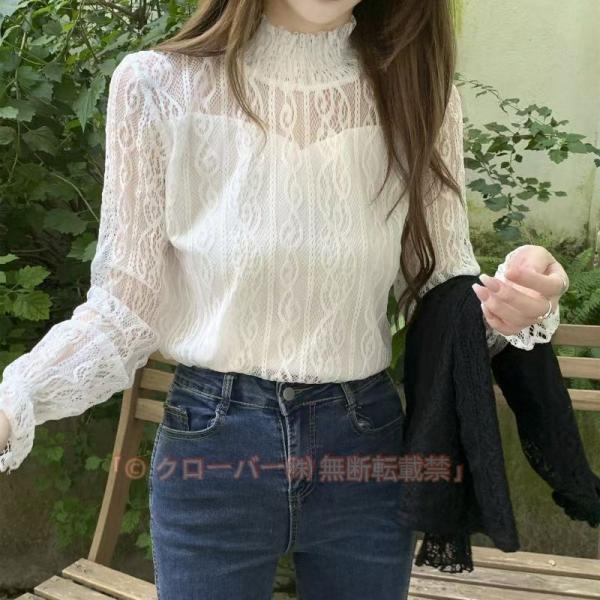 レース ブラウス レディース フリル シースルー トップス 花柄 プチハイネック きれいめ おしゃれ 長袖 トップス 透け感 ブラウス 重ね着