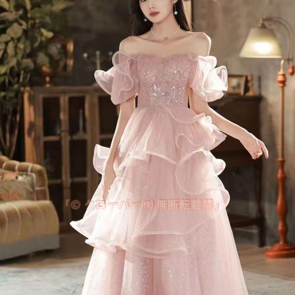 パーティードレス 結婚式ドレス 二次会ドレス ピンク 可愛い ロングドレス オフショルダー キラキラ スパンコール 発表会ドレス 成人式ドレス ロング