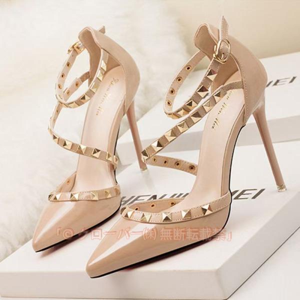パンプス アンクルストラップ スタッズ ハイヒール オフィス 結婚式 痛くない 歩きやすい ポインテッドトゥ ヒール10cm 美脚パンプス フォーマル 大きいサイズ