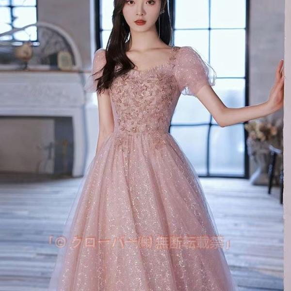 ピアノ発表会 ドレス 大人 半袖 マキシ丈 無地 刺? ワンピース レディース 女の子 中学生 高校生 ピアノ ウェディング レース ピンク