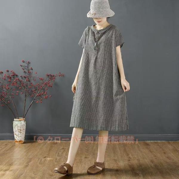 ワンピース 半袖 レディース シャツワンピース 夏 リネンワンピース ギンガムチェック Aライン 半袖ワンピース ひざ丈 ゆったり 体型カバー かわいい Aラインワ