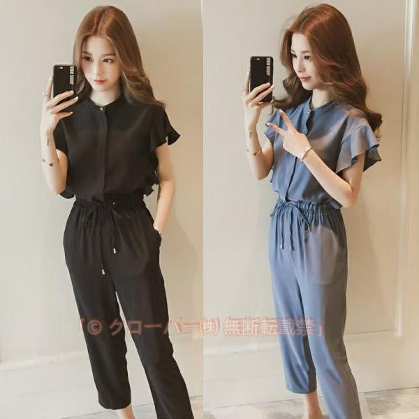 セットアップ レディース きれいめ 40代 夏 半袖 七分丈パンツ ズボン シフォン 韓国風 ボーダー 前リボン 通勤 OL 着痩せ オシャレ