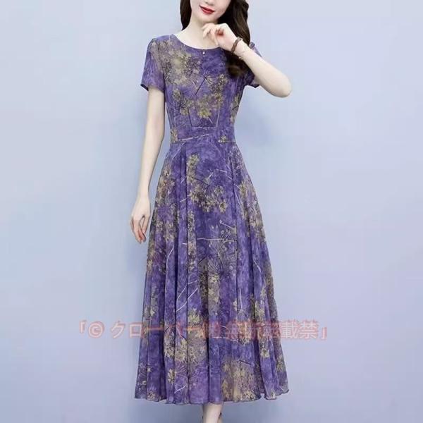 ワンピース 半袖 ロングワンピース フレアワンピース レディース夏服 ドレスワンピース フォーマル エレガント Aライン スリム 花柄 パープル クールネック