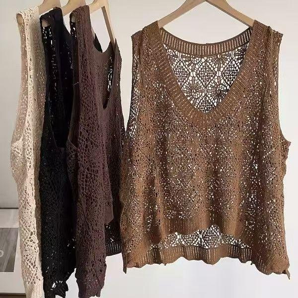 トップス ベスト 透かし編み 透かし編み ベスト レディース Vネック おしゃれ かぎ編み 薄手 カジュアル プルオーバー 春夏 無地 レイヤード き