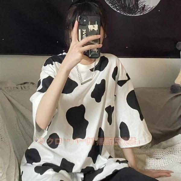Tシャツ 半袖 レディース 牛柄Tシャツ カットソー トップス 牛柄 ゆったり 体型カバー カジュアル ホワイト 可愛い ダルメシアン 春夏