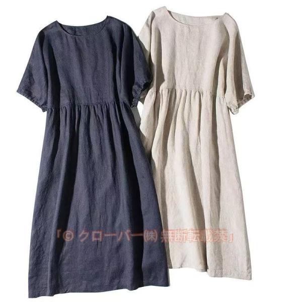夏【M?2XL展開】綿麻 ゆったり 大きめサイズ 女性 韓国版 ウエストを収めて痩せて見える 丸首の半袖ワンピース女性