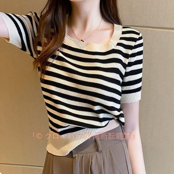 サマーニット 半袖 レディース トップス スクエアネック ボーダー柄 プルオーバー 婦人服 女性用 カジュアル 横縞 おしゃれ デイリー お出掛け