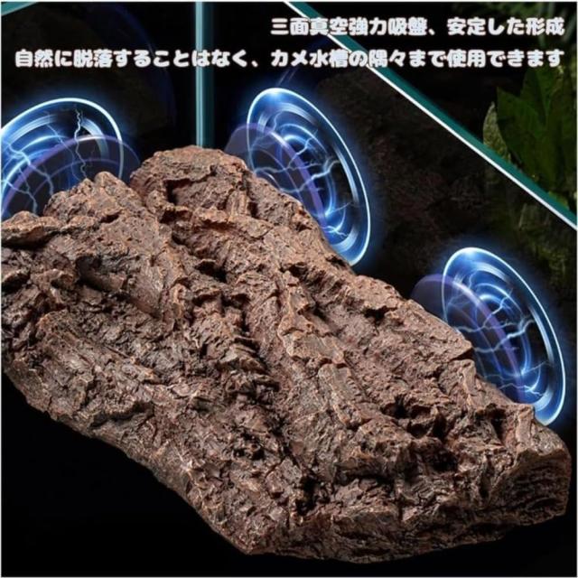 大きい亀の浮島 水亀 陸地模擬樹皮、岩石、黄蝋石 3つの強力な吸盤亀 浮き島 水生カメおよび半水生カメに適しています 落ちたりカスが出たりしない 樹脂素材 摩