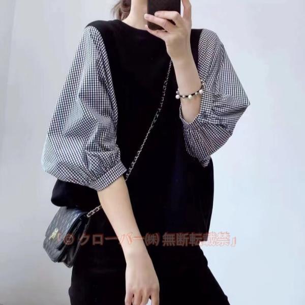 tシャツ 七分袖 レディース ブラウス 切替 ゆったり ボリューム袖 バルーン袖 ドッキング 重ね着 ドルマンスリーブ とろみ チェック柄 無地 春夏