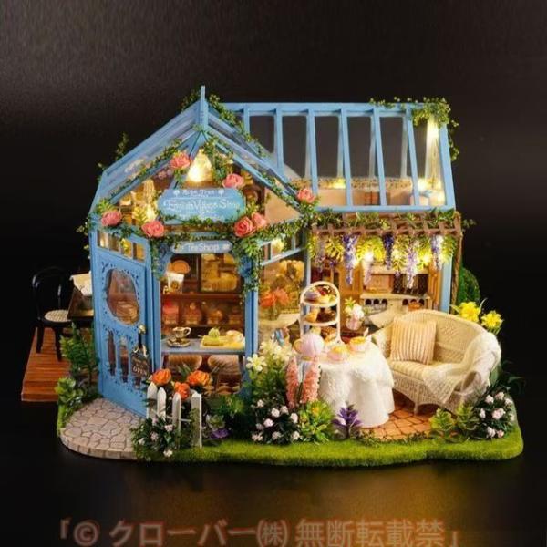 本商品はミニチュアのドールハウスの手作りキットになります。インテリアにも最適な、薔薇が咲き誇るティーハウスのドールハウスです。シャビーなブルーの外観と薔薇、店内のケーキの調和が美しい。箱?説明書は中国語で書かれていますが、図解されていますので理解できます。初心者の方でも作って頂けるよう、説明書はフルカラーで全行程が丁寧に解説されています。初心者の方でも安心です。