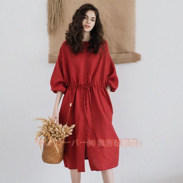 ワンピース レディース リネン風 シャツワンピース 夏 春 五分袖 Aライン ウエストリボン ウエストマーク 大きいサイズ 3L 黒 赤 バルーンスリーブ バルーン袖 バンドカラー 膝下丈 シンプル カジュアル ナチュラル 20代 30代 40代 レッド グリーン ブラック ワインレッド ネイビー ブラウン ベージュ