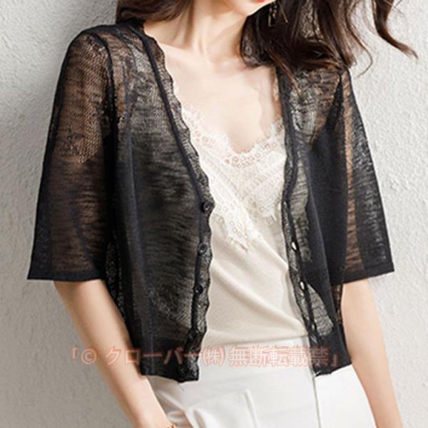 トップス レディース 夏 コンサバ カーディガン 5分袖 半袖 Vネック レース編み 透け感 羽織もの ショート丈 黒 緑 白 桃 ベージュ 灰 大きいサイズ オフィス